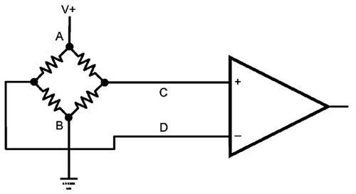 例如,正常使用時(shí),如果電橋沒有應(yīng)變,放大器的輸入則應(yīng)為V+/2。如果輸入在C點(diǎn)和D點(diǎn)短路,放大器的輸入仍是V+/2。但是當(dāng)電橋應(yīng)變時(shí),放大器輸入端將不再出現(xiàn)電壓差,每路輸入電壓都將保持在V+/2。該故障可用如下方法檢測(cè):在C點(diǎn)注入小電流,之后測(cè)量壓降。如果沒有短路,放大器會(huì)測(cè)出電橋內(nèi)電阻上的壓降;如果在C點(diǎn)和D點(diǎn)短路,壓降就會(huì)非常小。