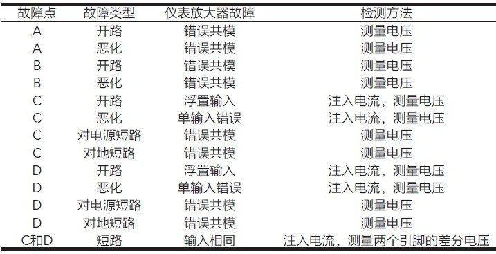 表1給出了每種故障及其相應(yīng)的檢測(cè)方法。例如,如果B點(diǎn)的連接開路了,儀表放大器的兩個(gè)輸入端電壓都會(huì)被拉到V+。通過測(cè)量?jī)x表放大器的一個(gè)輸入,只要該輸入的共模電壓不是預(yù)期的V+/2,就說明確實(shí)發(fā)生開路了。