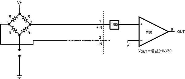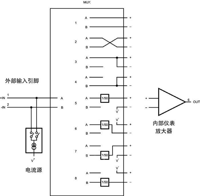 如果圖1中B點(diǎn)斷開,點(diǎn)C和點(diǎn)D的電壓都為V+,這超出了LMP8358的輸入共模電壓范圍,在+5V供電的情況下后者為- < CMVR < 。如果LMP8358內(nèi)部寄存器配置為使用多路復(fù)用器的第5路(如圖2),那么外部+IN引腳處的輸入電壓就需除以50,從而使輸入回到內(nèi)部?jī)x表放大器的共模電壓范圍內(nèi)。內(nèi)部?jī)x表放大器的負(fù)輸入將連到電源負(fù)極。儀表放大器增益設(shè)為50,輸出就表示了外部+IN引腳處的電壓。如圖3所示。