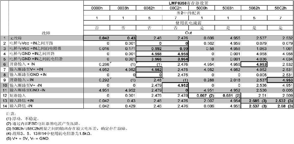 0000h設(shè)置將其放大了10倍到40mV輸出,而0003h則放大了100倍。第一行余下的值則是六個(gè)錯(cuò)誤測(cè)試下的典型值。表中2~14行框中粗體字的值是在特定故障下LMP8358的輸出。例如,如果+IN引腳短路到V+(第7行),當(dāng)LMP8358寄存器設(shè)為0082h時(shí)輸出即為V+。